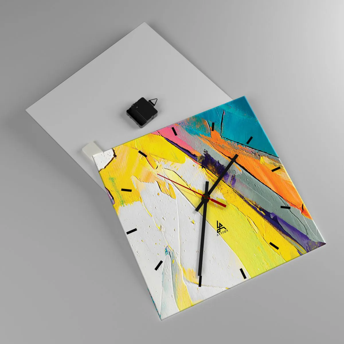 Uret er fremstillet af 4 mm tykt sikkerhedsglas. Urets fremstillingsteknologi er i overensstemmelse med sikkerhedsklasse 2B2 i henhold til EN 12600:2004, hvilket garanterer slagfasthed. Uret på glas er klar til at blive hængt op - det har et metalophæng fastgjort på bagsiden af uret og en skumafstandsholder til at regulere urets lige afstand fra væggen. Uret har en lydløs mekanisme, der drives af et 1,5 V - AA-batteri (batteri medfølger ikke).