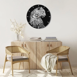 "Right Profile Perfect!" er et vægur, der udstråler styrke, elegance og fred. Hovedmotivet er en leopard vist i et perfekt portræt, fanget i sort-hvid. Den minimalistiske komposition og den dybsorte baggrund fremhæver hver eneste detalje i rovdyrets pels og silhuet og fremhæver dets majestætiske holdning. Billedet betagende med sin enkelhed og intensitet i budskabet.