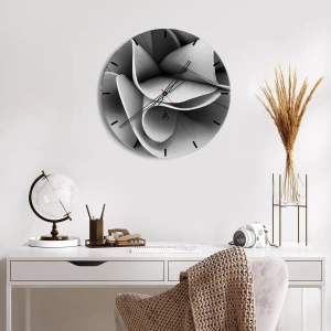 - Dette vægur har et sort-hvidt nærbillede af en abstrakt form, der ligner en delikat blomst. Dette moderne motiv tilføjer elegance og kunstnerisk udtryk til rummet.
