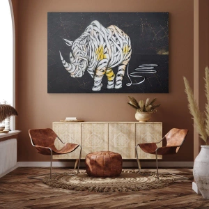 Lærredstryk - Billede på lærred - Et udskåret næsehorn med abstrakte striber på en mørk baggrund. - 70x50cm - Afstumpethed er en myte - Moderne vægdekoration til stue og soveværelse ARTTOR