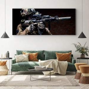 Lærredstrykket "Soldat i fuldt udstyr med en riffel" er et udtryk for styrke, præcision og professionalisme. Det forestiller en soldat i fuld uniform og taktisk udstyr, der holder en riffel klar til handling. Detaljer som natkikkerter, beskyttelsesudstyr og tilbehør på uniformen understreger det høje niveau af avancement og militær forberedelse.