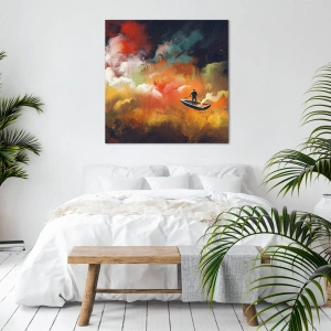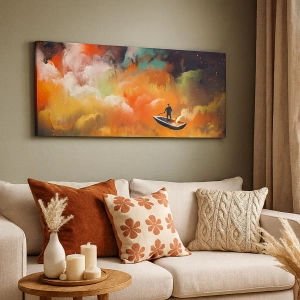 - Maleriet forestiller en figur i en båd mod en baggrund af finurlige, farverige skyer. Perfekt til moderne interiører, det bringer inspiration og magi.