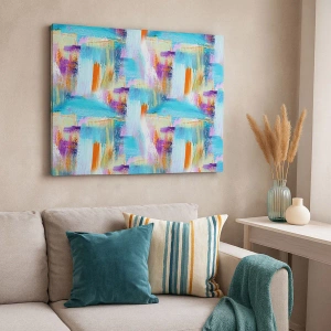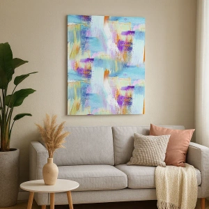 Lærredet er spændt op over rammen. Siderne og kanterne trykkes for at danne en fortsættelse af billedet. Maleriet er klar til at blive hængt op på væggen. Hvert produkt har en bøjle, der er fastgjort til rammen, og et samlesæt (skrue + dyvel).