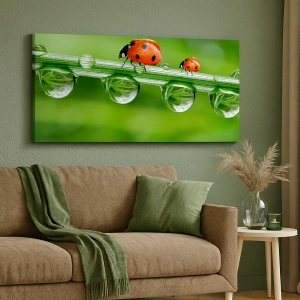 Lærredet er spændt op over rammen. Siderne og kanterne trykkes for at danne en fortsættelse af billedet. Maleriet er klar til at blive hængt op på væggen. Hvert produkt har en bøjle, der er fastgjort til rammen, og et samlesæt (skrue + dyvel).
