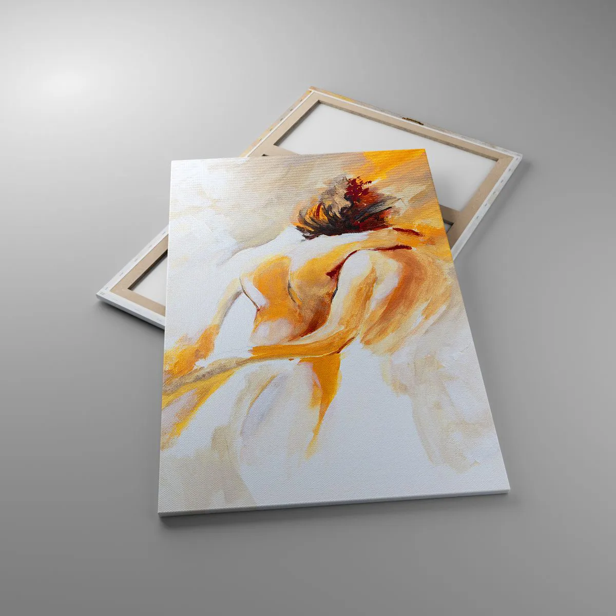 Lærredet er spændt op over rammen. Siderne og kanterne trykkes for at danne en fortsættelse af billedet. Maleriet er klar til at blive hængt op på væggen. Hvert produkt har en bøjle, der er fastgjort til rammen, og et samlesæt (skrue + dyvel).