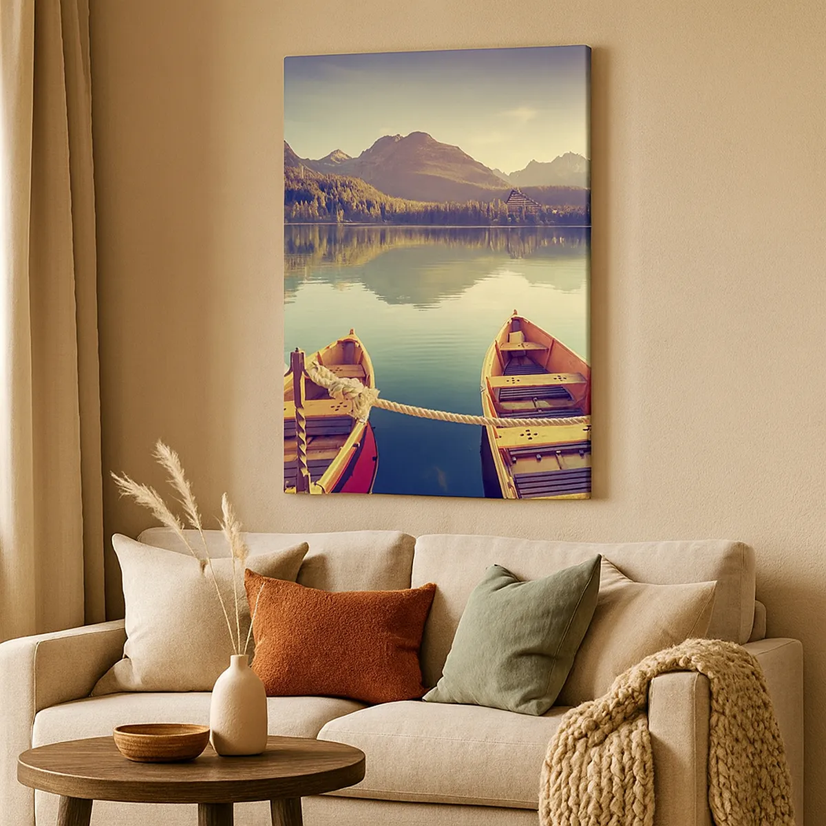 Lærredet er spændt op over rammen. Siderne og kanterne trykkes for at danne en fortsættelse af billedet. Maleriet er klar til at blive hængt op på væggen. Hvert produkt har en bøjle, der er fastgjort til rammen, og et samlesæt (skrue + dyvel).