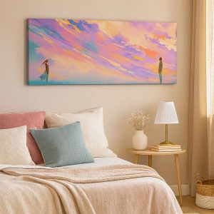 - Dette unikke lærredsmaleri skildrer en dynamisk scene med to figurer mod en farverig solnedgangshimmel. En perfekt dekoration, der bringer følelser og elegance til ethvert interiør.