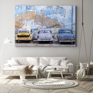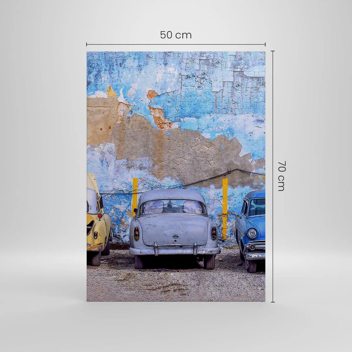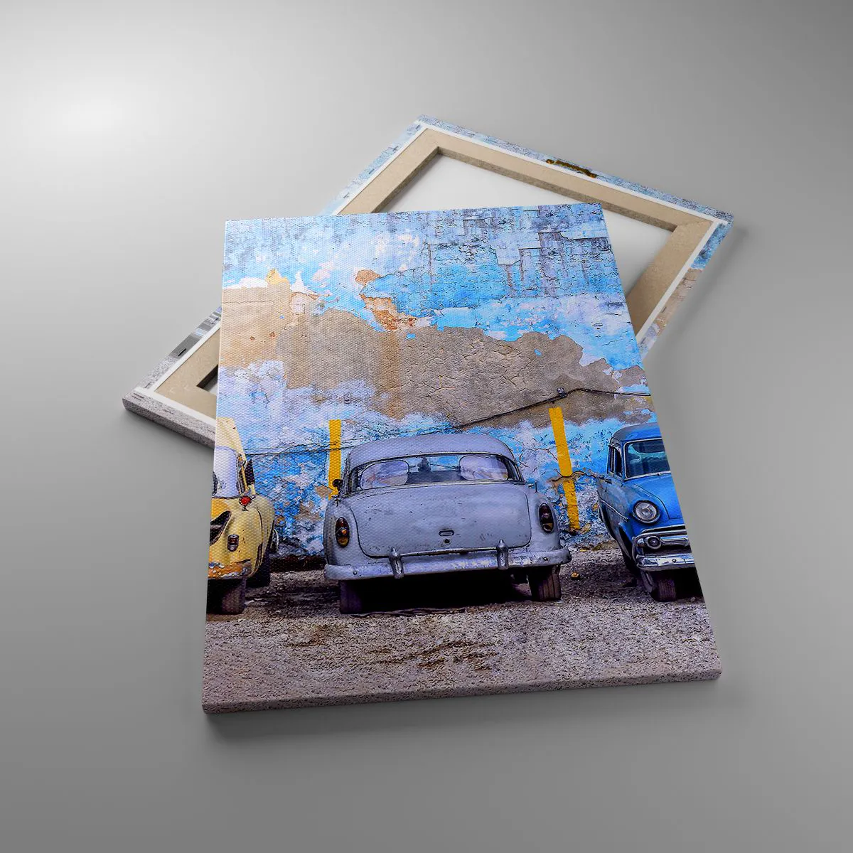 Lærredet er spændt op over rammen. Siderne og kanterne trykkes for at danne en fortsættelse af billedet. Maleriet er klar til at blive hængt op på væggen. Hvert produkt har en bøjle, der er fastgjort til rammen, og et samlesæt (skrue + dyvel).