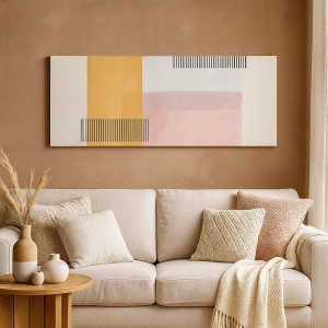 Lærredet er spændt op over rammen. Siderne og kanterne trykkes for at danne en fortsættelse af billedet. Maleriet er klar til at blive hængt op på væggen. Hvert produkt har en bøjle, der er fastgjort til rammen, og et samlesæt (skrue + dyvel).