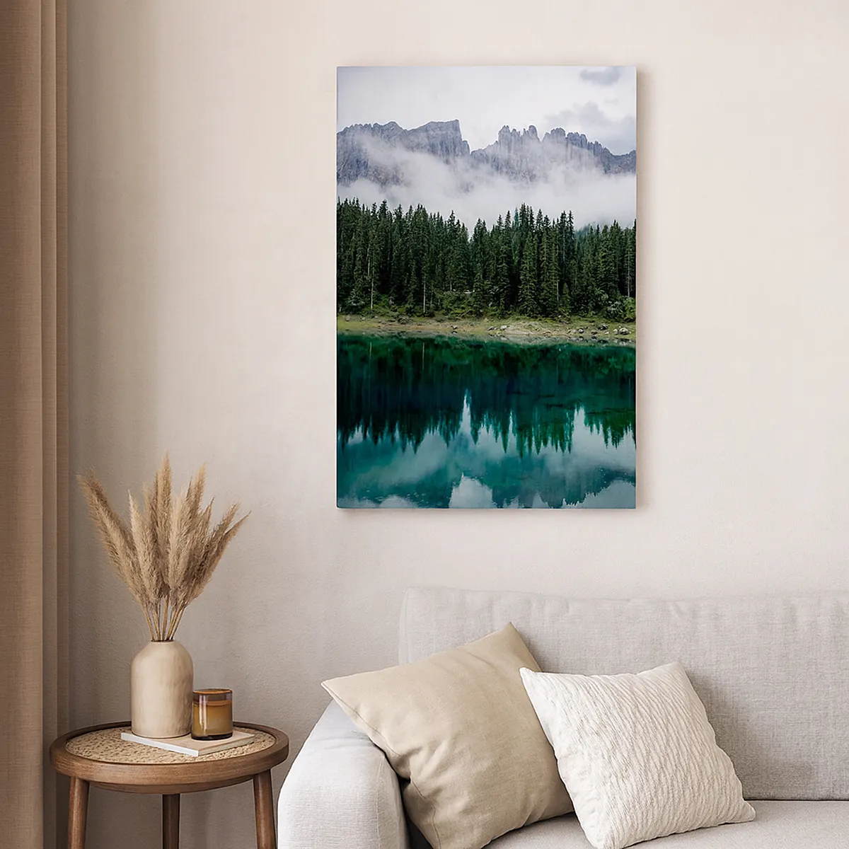 Lærredet er spændt op over rammen. Siderne og kanterne trykkes for at danne en fortsættelse af billedet. Maleriet er klar til at blive hængt op på væggen. Hvert produkt har en bøjle, der er fastgjort til rammen, og et samlesæt (skrue + dyvel).