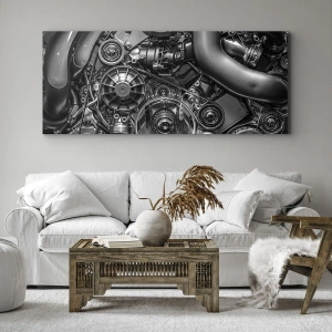 Maleriet "Mekanikkens poesi" er et unikt værk inspireret af motor- og teknologiverdenen, der skildrer detaljerne i en bilmotor i sort-hvid. Denne kunstneriske komposition fremhæver skønheden i ingeniørkunst og præcisionen i mekanikken og begejstrer med sin minimalistiske æstetik. Dette lærredskunst er et fremragende valg for elskere af motor, teknologi og moderne indretning.