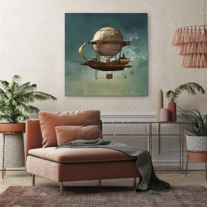 Lærredstryk - Billede på lærred - Et fantastisk luftskib mod den grønlige himmel - 70x50cm - Jules Verne hilser - Moderne vægdekoration til stue og soveværelse ARTTOR