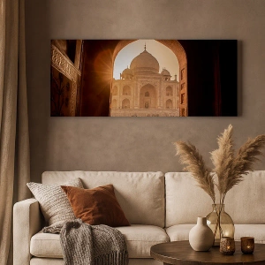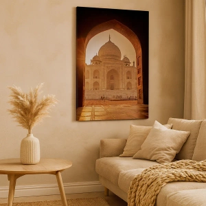 Lærredsmaleri "Monument over ujordisk kærlighed" transporterer beskueren til den magiske atmosfære i et af verdens mest ikoniske monumenter – Taj Mahal. Perspektivet gennem portbuen giver scenen en unik charme, og solens varme stråler oplyser marmorkuplerne og de arkitektoniske detaljer og understreger deres ekstraordinære harmoni og symmetri.