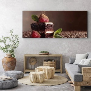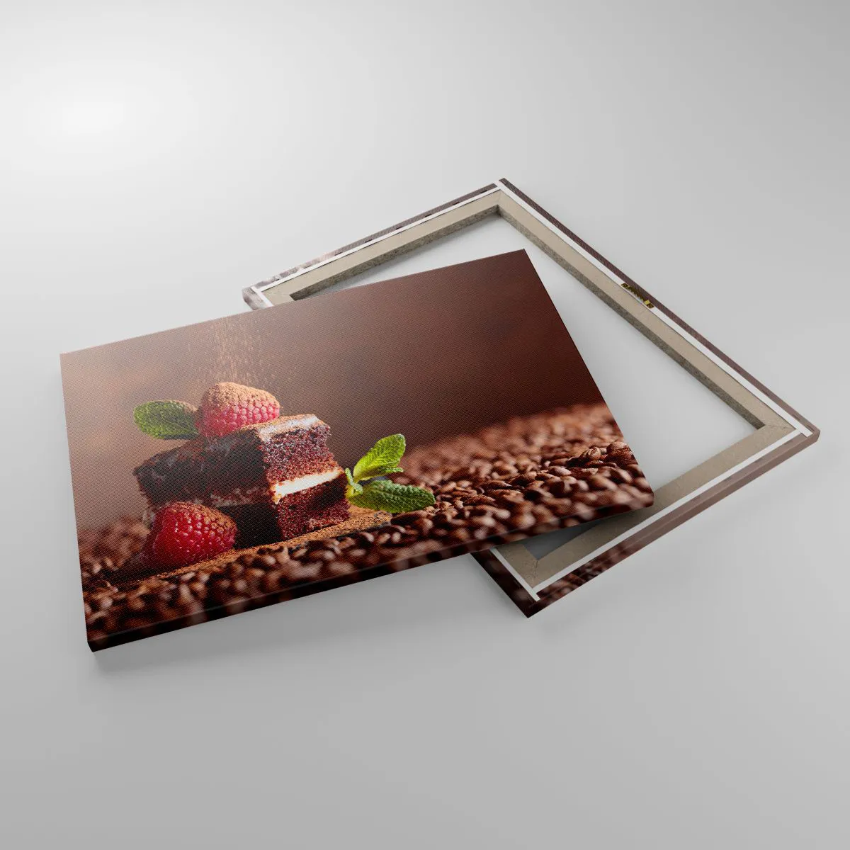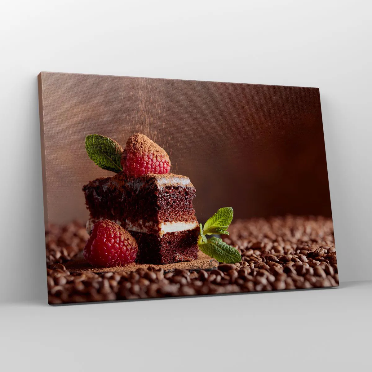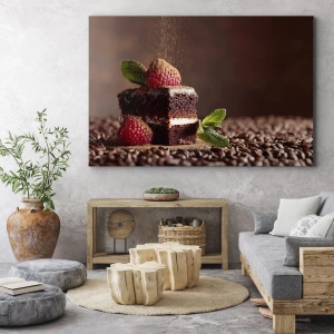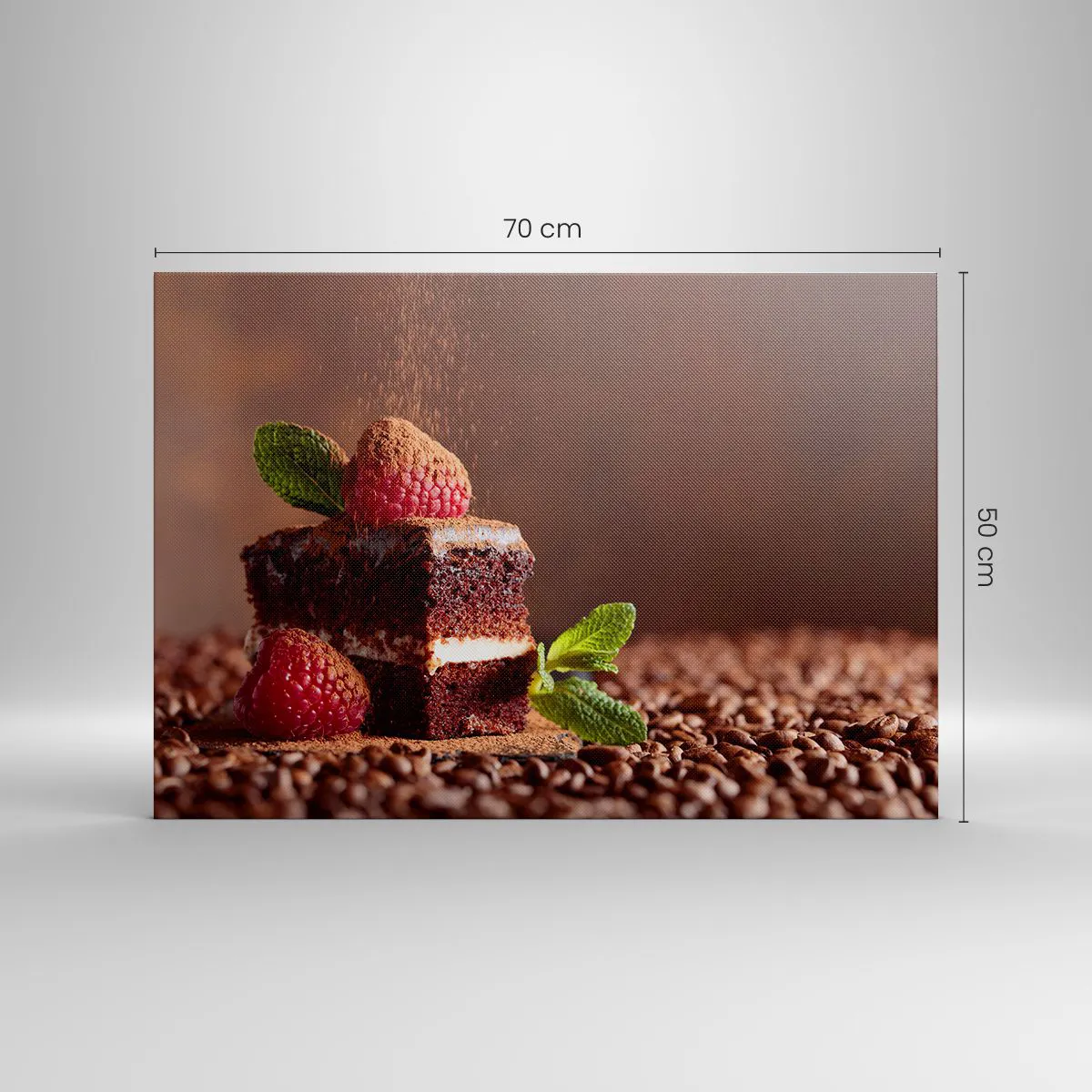 Lærredstryk - Billede på lærred - Chokoladekage med hindbær og mynte på en baggrund af kakaobønner - 70x50cm - Livet er sødt - Moderne vægdekoration til stue og soveværelse ARTTOR