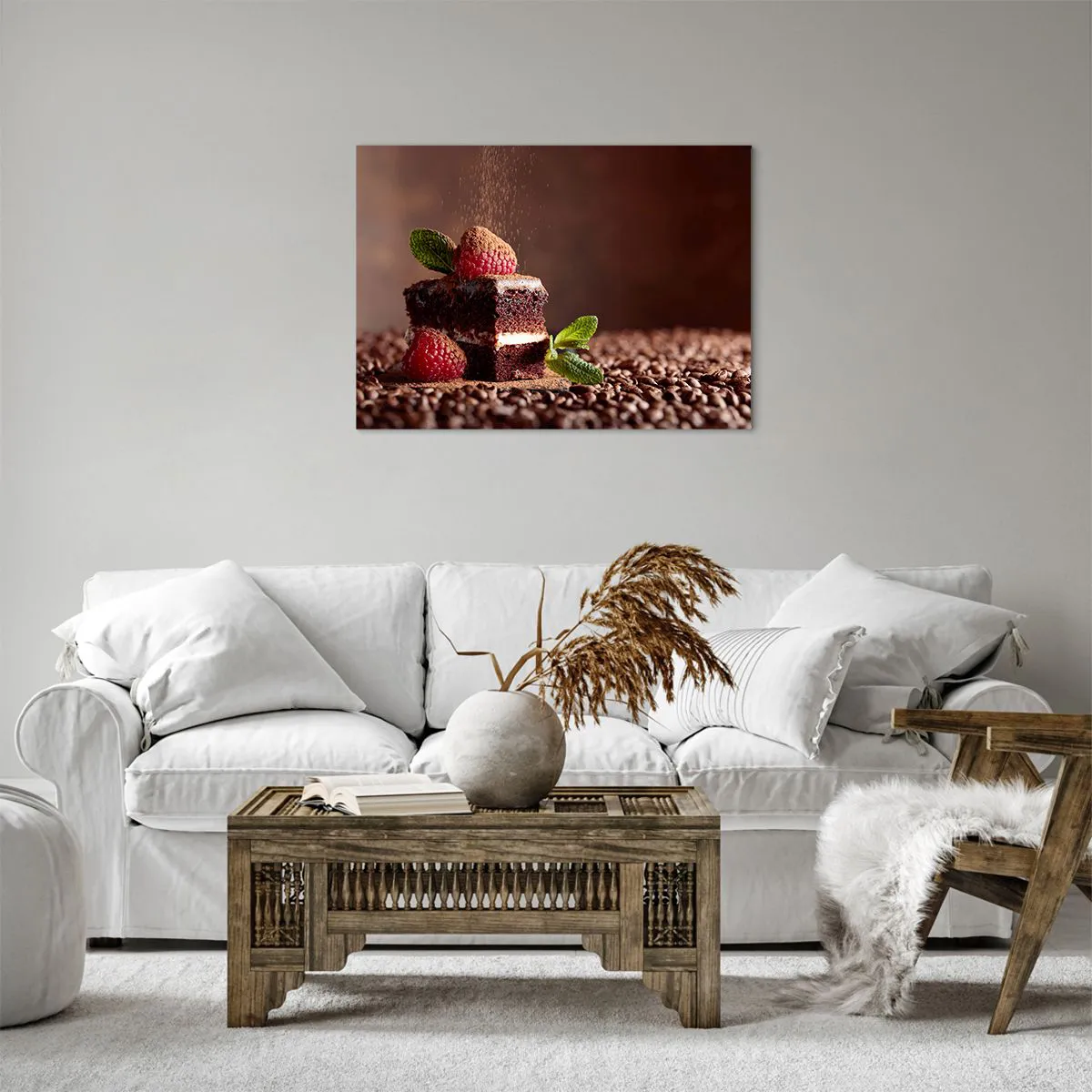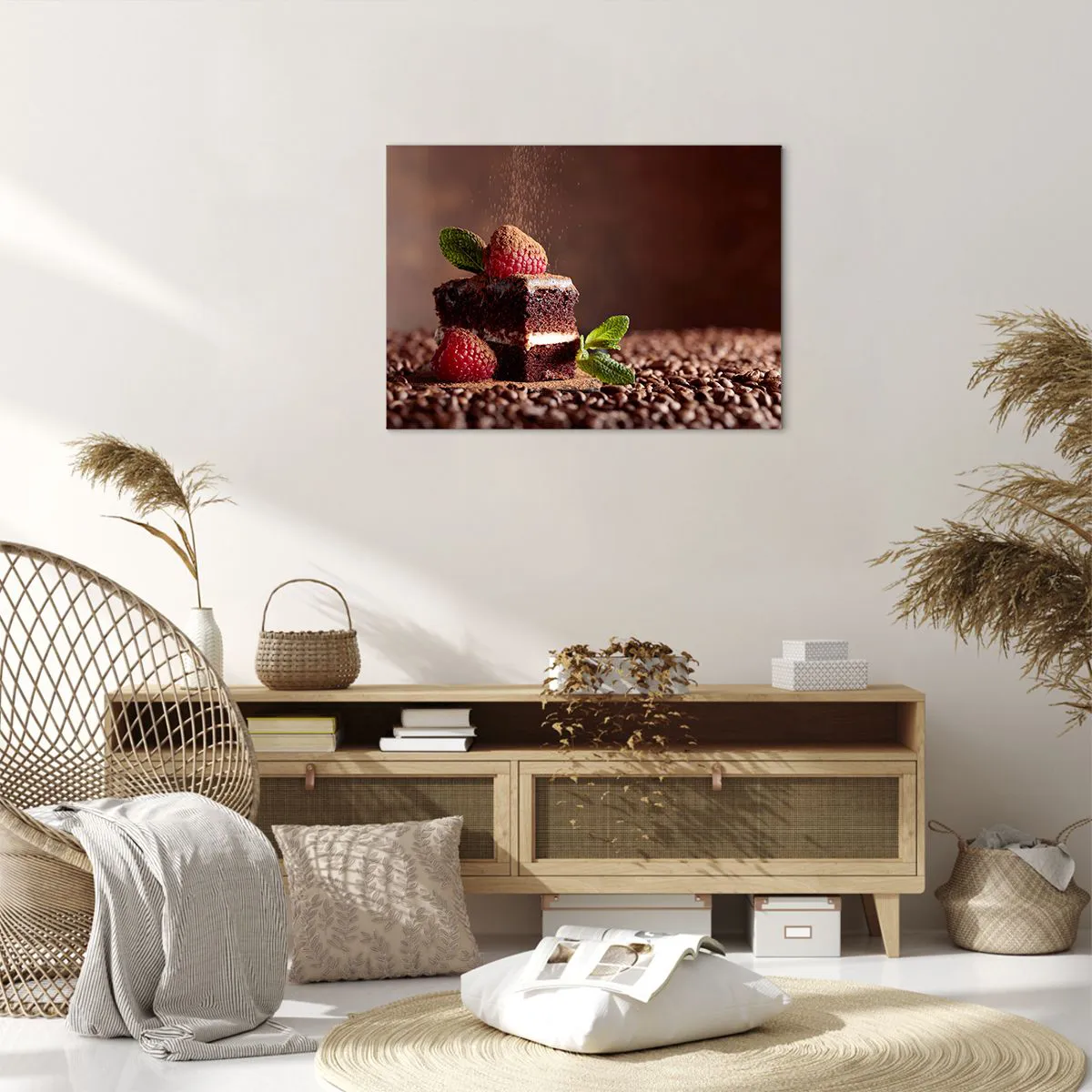 Lærredstryk "Life is Sweet" er en unik dekoration, der transporterer os til en verden af søde glæder. Det forestiller en chokoladekage dekoreret med friske hindbær og mynteblade mod en baggrund af kakaobønner. De varme brune nuancer og den intense røde farve fra hindbærrene kombineret med myntens grønne farve skaber en harmonisk komposition, der begejstrer med både æstetik og detaljer.