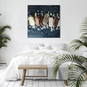 - Maleriet forestiller farverige ispinde arrangeret på isterninger, alt sammen mod en mørk baggrund. Det er den perfekte dekoration for sommerelskere og dem, der elsker søde sager, perfekt til køkkener, caféer eller moderne interiører.