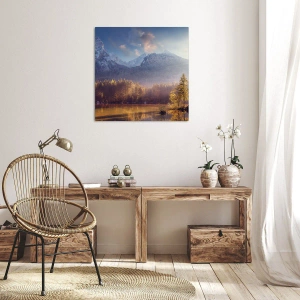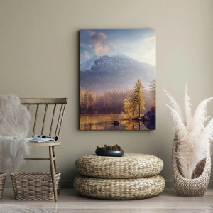 Lærredsbilledet "I bjergene og dalene" er en unik vægdekoration, der indfanger naturens skønhed, når den er mest fredfyldt. Scenen forestiller et bjerglandskab med en majestætisk skov og en rolig sø, hvis overflade reflekterer det gyldne lys fra den opgående sol. Bjergene i baggrunden tilføjer dybde til landskabet og understreger dets maleriske præg.