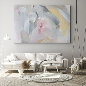 Lærredsmaleriet "I en pastelverden" er en moderne dekoration, der kombinerer delikatesse med kunstnerisk udtryk. Kompositionen, baseret på subtile penselstrøg, der skaber et abstrakt arrangement i nuancer af lyserød, grå og gul, bringer harmoni og elegance til ethvert interiør.