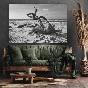 Lærredstryk - Billede på lærred - Sort-hvidt landskab med et dødt træ på stranden - 70x50cm - Havets skulptur - Moderne vægdekoration til stue og soveværelse ARTTOR