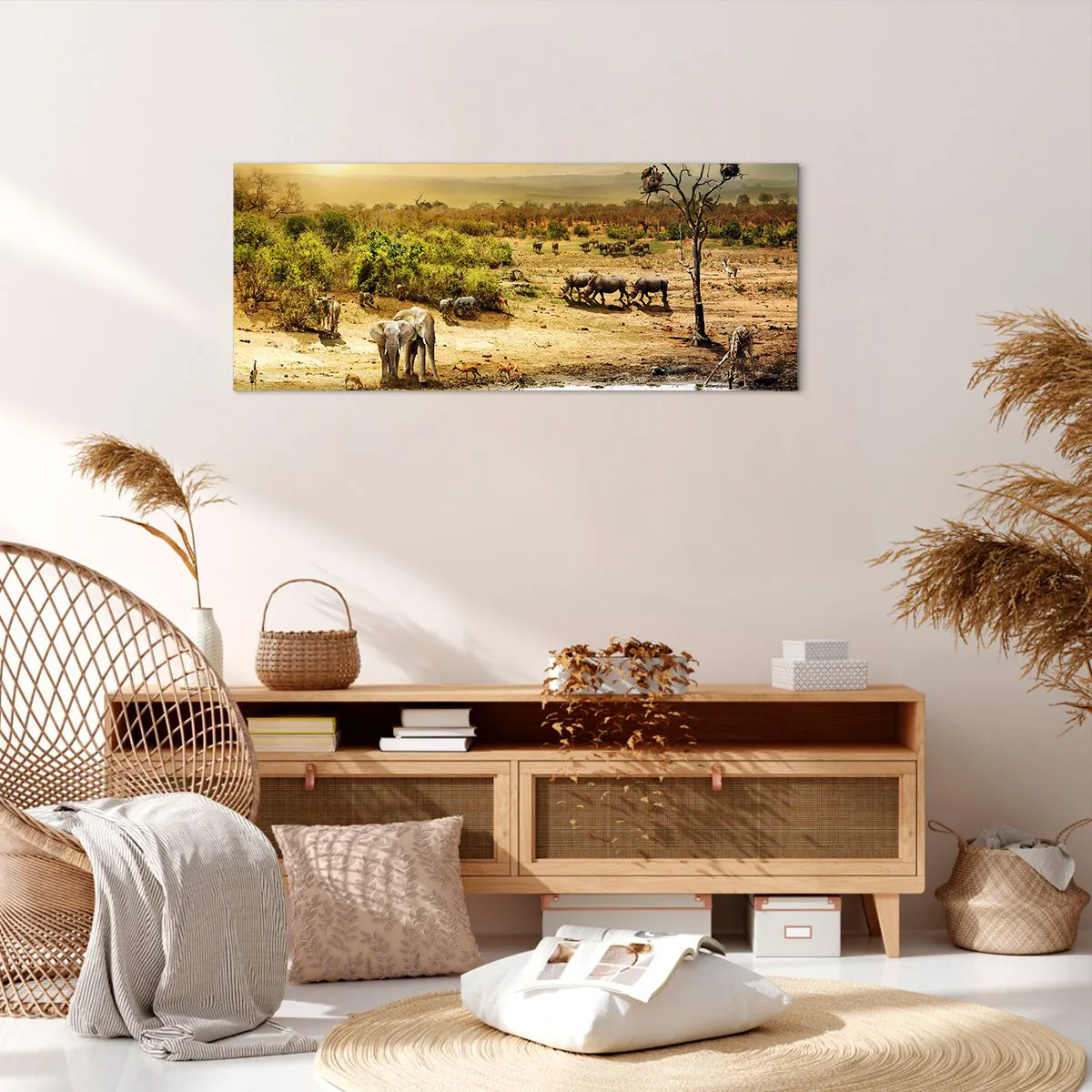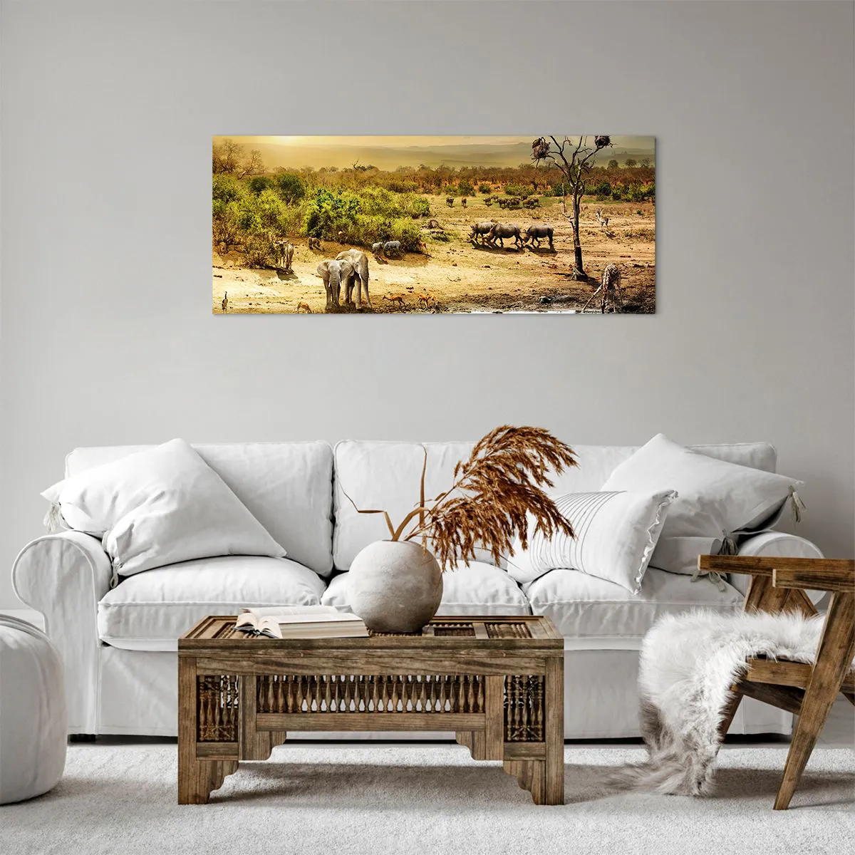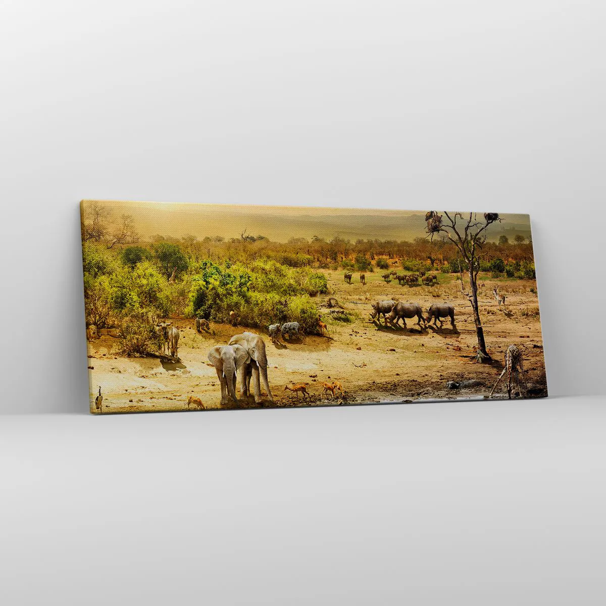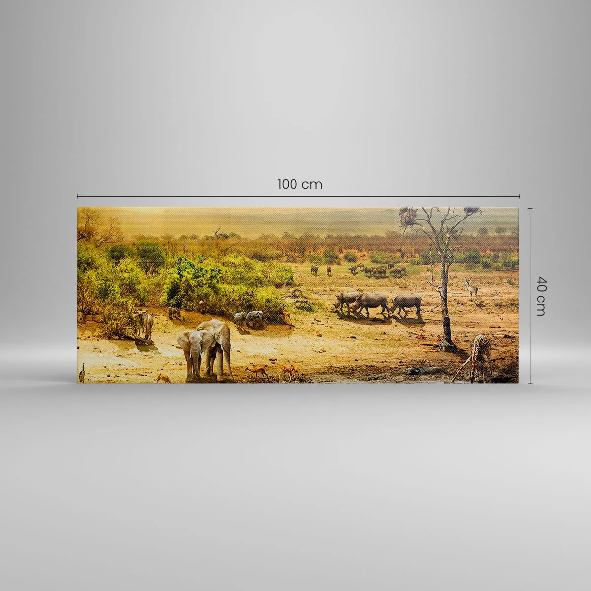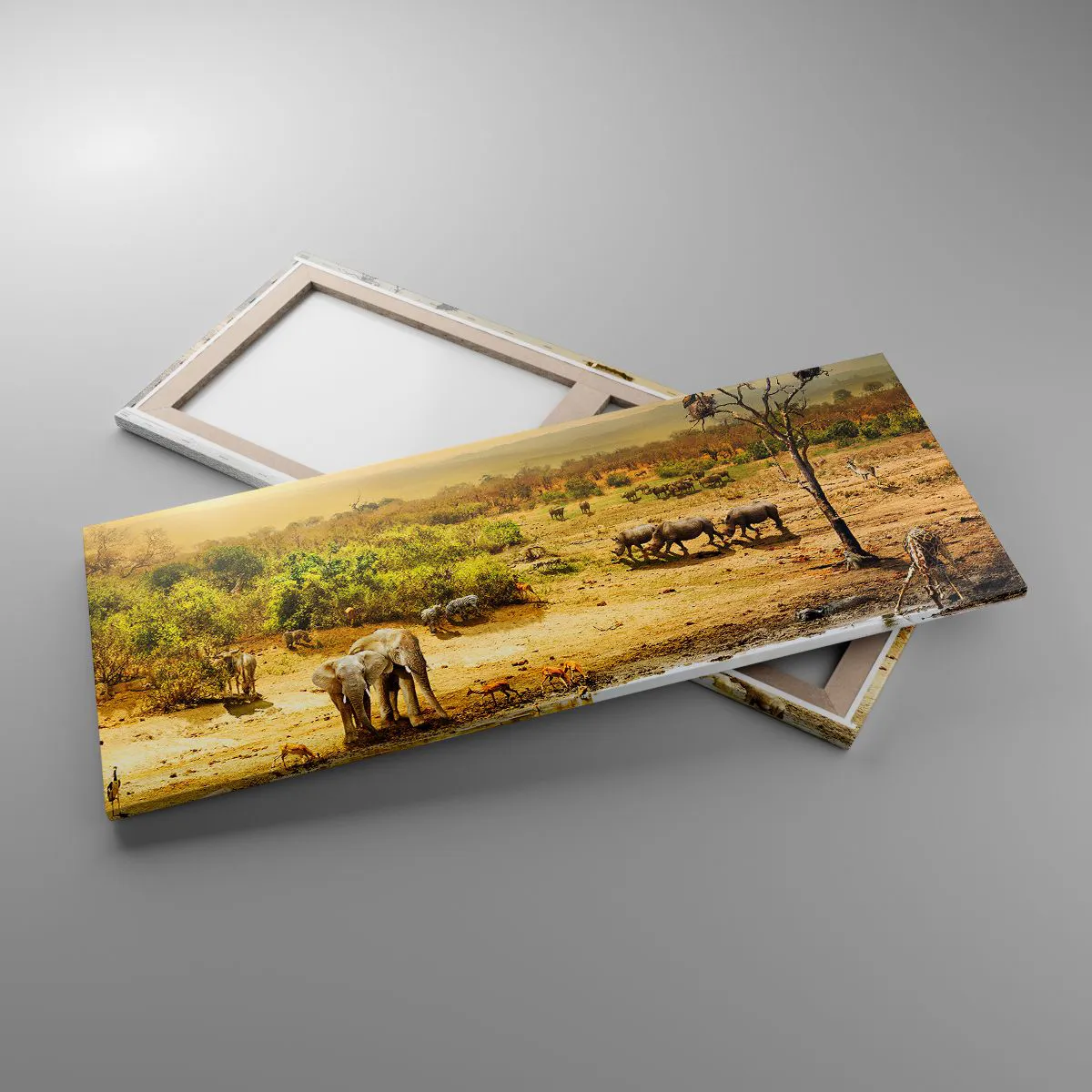 Lærredet er spændt op over rammen. Siderne og kanterne trykkes for at danne en fortsættelse af billedet. Maleriet er klar til at blive hængt op på væggen. Hvert produkt har en bøjle, der er fastgjort til rammen, og et samlesæt (skrue + dyvel).