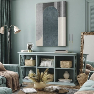 Den elegante komposition er kendetegnet ved sin enkle form, hvilket gør den perfekt til en stue, et soveværelse eller et kontor. Det geometriske mønster understreger harmoni og balance og bringer ro og raffinement til rummet.