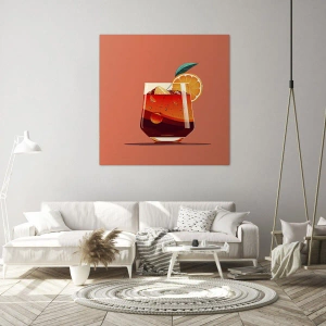 - Et minimalistisk maleri, der forestiller et glas drikke og en appelsinskive mod en orange baggrund. Perfekt til moderne interiører, det bringer friskhed og energi.