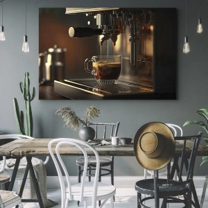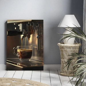 • Dette lærredstryk på 70x50 cm forestiller en moderne espressomaskine med en kop friskbrygget espresso. Det er det perfekte dekorative stykke for kaffeelskere og elegante interiører.
