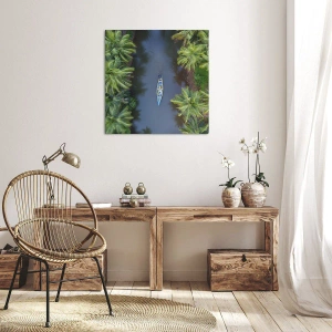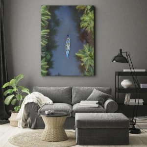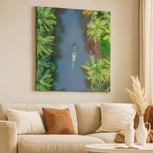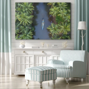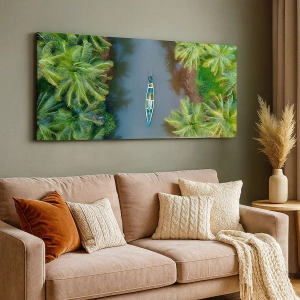 Vægkunst - På en tropisk sti - Båd på en flod omgivet af palmer fra fugleperspektiv