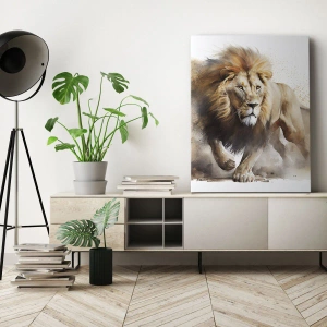 - Maleriet forestiller et dynamisk portræt af en løve i naturlige farver, der fremviser dyrenes konges styrke og majestæt. Perfekt til interiører med et moderne eller klassisk præg.