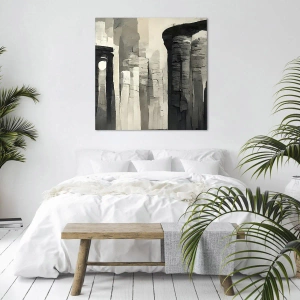 Maleriets komposition viser majestætiske søjler, der symboliserer styrke, stabilitet og tidløshed. Grå og sorte nuancer understreger stenens tekstur, hvilket giver maleriet dybde og raffinement. Subtilt lys og skygger skaber en harmonisk atmosfære, der bringer fred til ethvert interiør.