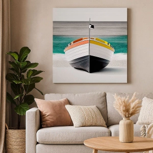 Lærredstryk - Billede på lærred - En båd på stranden med et turkisblåt hav i baggrunden - 70x50cm - På sin plads - Moderne vægdekoration til stue og soveværelse ARTTOR