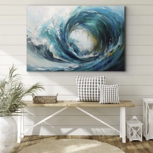 Lærredsbilledet "Havportal" er en unik dekoration, der begejstrer med sin dynamiske komposition og intense farver. Hoveddelen af maleriet skildrer en kraftfuld, hvirvlende bølge i nuancer af blå og turkis, som synes at oplive og introducere bevægelse til ethvert rum.