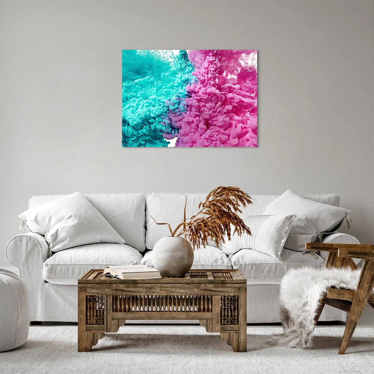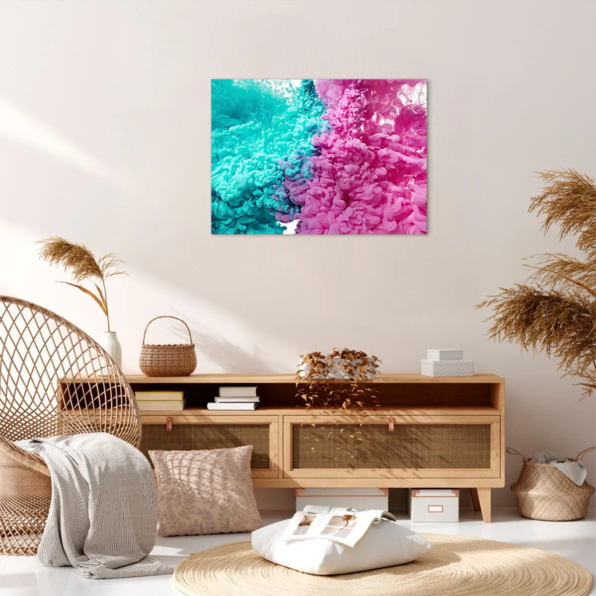 Lærredstryk - Billede på lærred - Farverige bølger af turkis og lyserød i en abstrakt form - 70x50cm - Et afgørende sammenstød - Moderne vægdekoration til stue og soveværelse ARTTOR