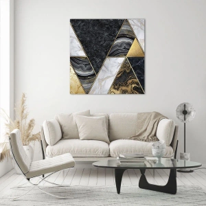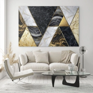 Hvert element i maleriet er omhyggeligt gennemtænkt for at formidle indtryk af luksus og elegance. Marmorteksturer i forskellige farver kombineret med skinnende gulddetaljer skaber en sofistikeret dekoration, der vil fungere perfekt i rum indrettet i en glamourøs, moderne eller minimalistisk stil. Brugen af guldlinjer mellem trekanterne tilføjer en ekstra effekt af dybde og struktur.