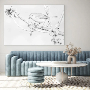 - En delikat sort-hvid komposition med en fugl, der sidder på en gren i et vinterlandskab. Maleriets minimalistiske natur bringer en følelse af ro og subtil elegance til interiøret.