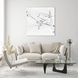 Billede på glas - En fugl siddende på en gren i et monokromatisk vintermotiv. - 70x50cm - Vintermorgen - Moderne vægdekoration til stue og soveværelse ARTTOR