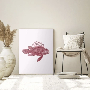 - Maleriet forestiller en eksotisk fisk i en præcis bordeauxfarvet skitse, placeret mod en lys baggrund. Dets minimalistiske form og nautiske tema gør det perfekt til et badeværelse eller en moderne indretning.