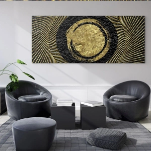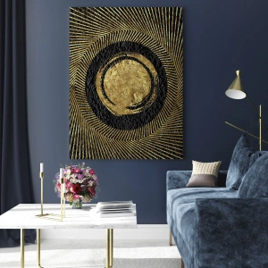 Den anvendte farvepalet - intens guld og dyb sort - skaber en atmosfære af luksus og eksklusivitet. Rytmiske, radiale linjer giver billedet dynamik, og den centrale cirkel er et stærkt fokuspunkt, der tiltrækker opmærksomhed. Hver detalje er blevet raffineret for at opnå harmoni mellem det kraftfulde budskab og værkets dekorative karakter. Det er et fremragende valg for dem, der værdsætter udtryksfulde former og elegant æstetik i et moderne miljø.