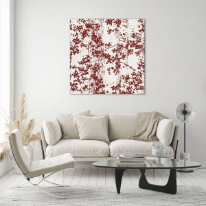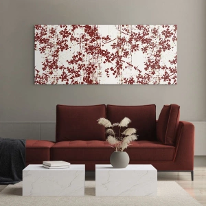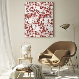 Farverne er i nuancer af rød og beige, hvilket giver kompositionen et harmonisk og naturligt udseende. Den slidte baggrundseffekt giver billedet dybde, og plantemotiverne bliver mere udtryksfulde. Blomstermønsteret er ikke påtrængende, men overrasker med sin delikatesse og charme. Det er en komposition, der bringer fred, subtilitet og en hjemlig følelse til interiøret.