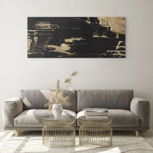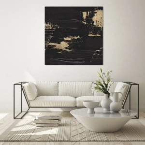 Maleriets minimalistiske, men udtryksfulde form gør det til omdrejningspunktet for ethvert arrangement. Farveskemaet, baseret på klassisk sort og metallisk guld, passer perfekt til interiører i en glamourøs, moderne, loft og endda industriel stil.