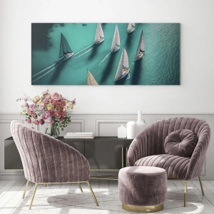 Dette glastryk er en dynamisk vægdekoration inspireret af den nautiske stil. Afbildningen af sejlbåde, der sejler hen over turkisblåt vand, symboliserer frihed, bevægelse og kontakt med naturen. Det er et fremragende valg for dem, der værdsætter havets energi og skønheden ved sejlads.
