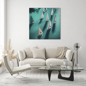 De dominerende blå og turkis farver kombineret med de lyse sejl skaber en komposition fuld af friskhed og lethed. Maleriet formidler en atmosfære af frihed, rummelighed og kontakt med naturen, der passer perfekt til æstetikken i kyst- og nautisk stil. Hver linje og skygge understreger fotografiets præcision og dybde.