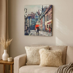 Lærredstryk - Billede på lærred - En charmerende bygade med et par under en rød paraply - 70x50cm - Regn til to - Moderne vægdekoration til stue og soveværelse ARTTOR