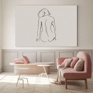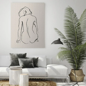 - Maleriet forestiller en diskret, lineær skitse af en siddende kvinde mod en lys baggrund. En minimalistisk form af en kvindelig nøgenfigur, perfekt til moderne og kunstneriske interiører.