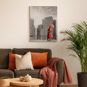 Lærredstryk - Billede på lærred - Et par i rødt med en paraply mod en baggrund af et bylandskab - 70x50cm - Et menneske, ikke en sten - Moderne vægdekoration til stue og soveværelse ARTTOR