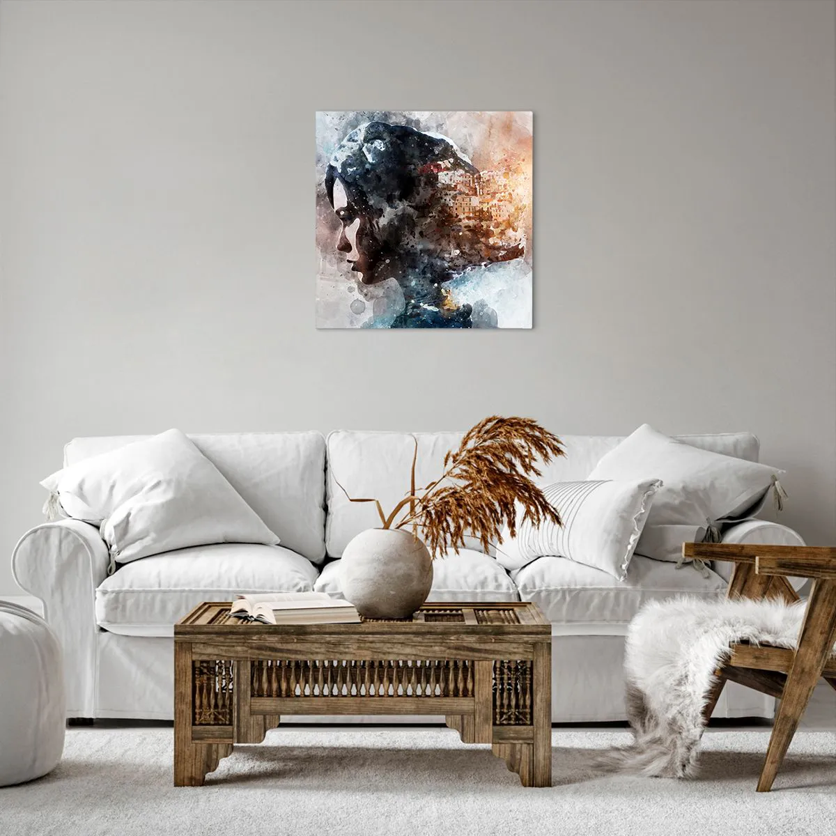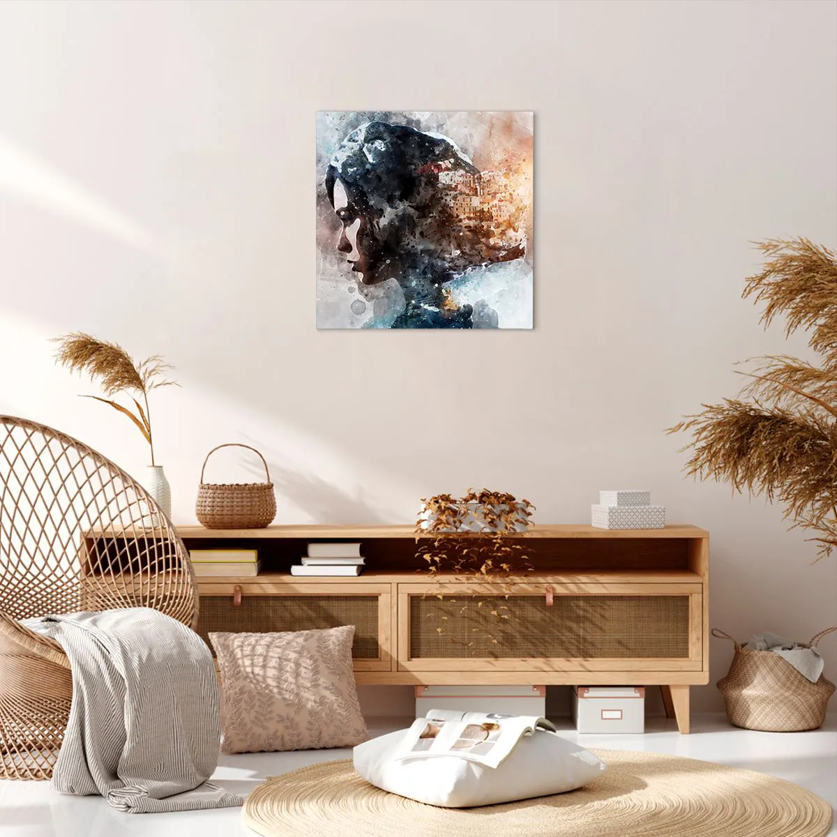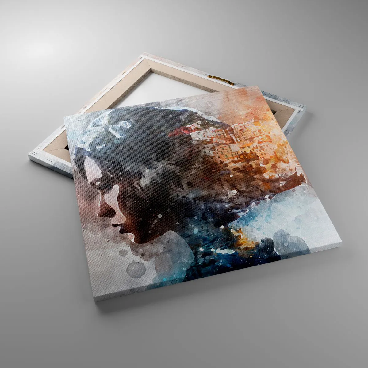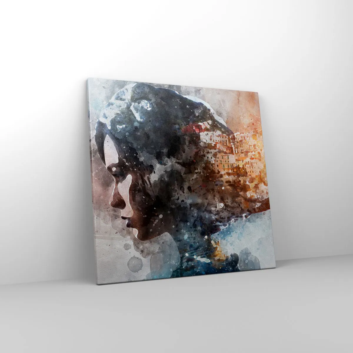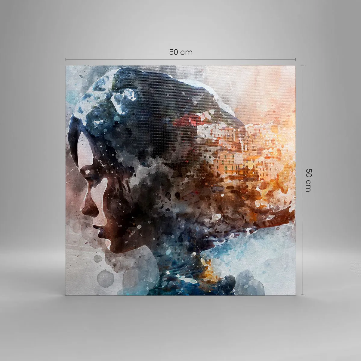 Lærredstryk - Billede på lærred - Historien om en pige med en by i baggrunden - 50x50 cm