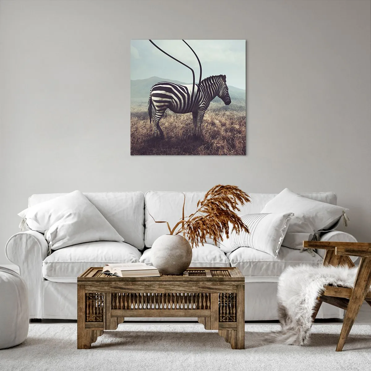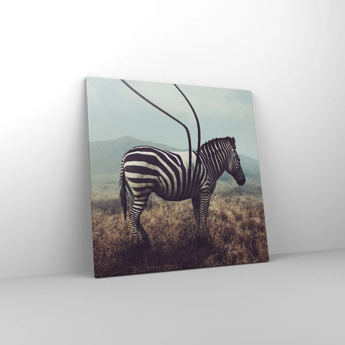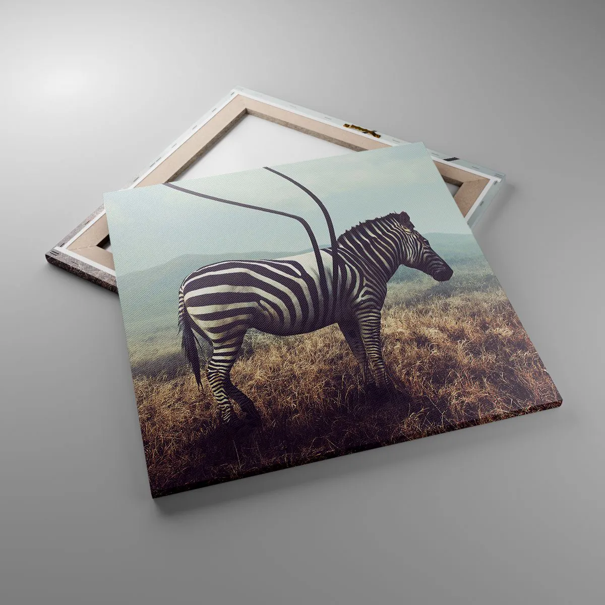 Lærredet er spændt op over rammen. Siderne og kanterne trykkes for at danne en fortsættelse af billedet. Maleriet er klar til at blive hængt op på væggen. Hvert produkt har en bøjle, der er fastgjort til rammen, og et samlesæt (skrue + dyvel).