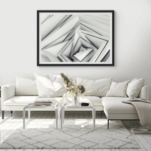- Denne plakat forestiller en tredimensionel abstraktion af geometriske trekanter. Illusionen af rum og præcise linjer skaber en moderne, minimalistisk komposition, der er ideel til stilfulde interiører.