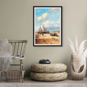 Plakat, der forestiller et realistisk landskab med traditionelle fiskerbåde og fiskere, der hviler efter en vellykket fangst. Maleriet indfanger roen ved kystlivet og strabadserne ved arbejdet til søs, i tråd med den klassiske stil inden for realistisk maleri.