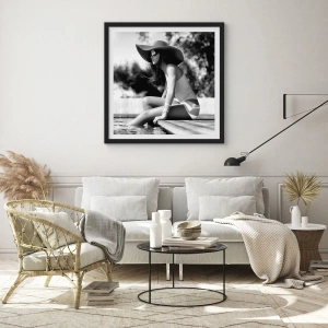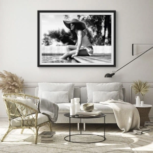 Plakat i sort ramme - Et sort-hvidt fotografi af en kvinde iført hat, der sidder ved vandet. - 50x70cm - Sommerdrøm - Moderne vægdekoration til stue og soveværelse ARTTOR